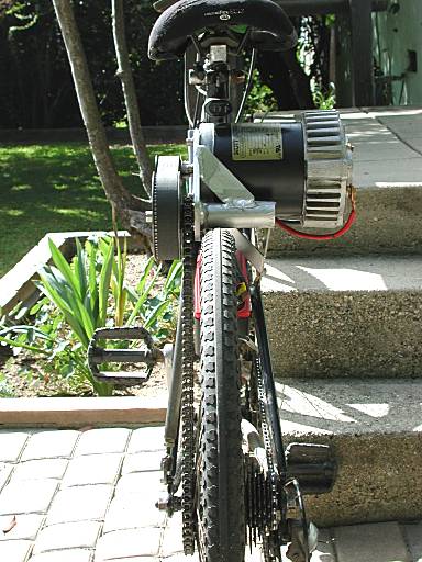 The motor is mounted to the bicycle frame on a specially made 1/8" thick stainless steel bracket. The whole bracket bolts to tabs welded to the bike frame with three allen bolts. The chain, drive belt and motor can be removed from the bike in about 3 minutes.